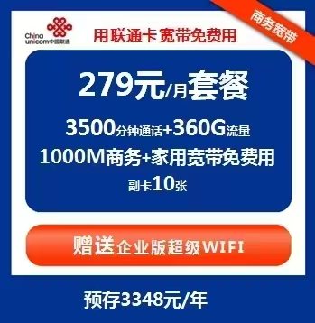 279元商务宽带,包含一条商务宽带,下行000M,上行350M,一条1000M家用宽带,每个月3500分钟通话,360G流量,送一套价值2590企业版的超级WiFi免费用,可以办理1-3张手机卡共用,最多可以办理10张手机号卡,3张以上每张卡5元功能费。直播、商务专用。